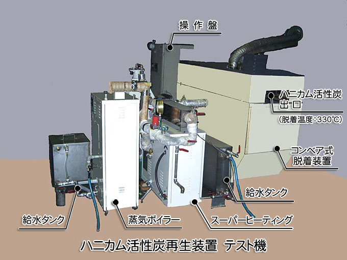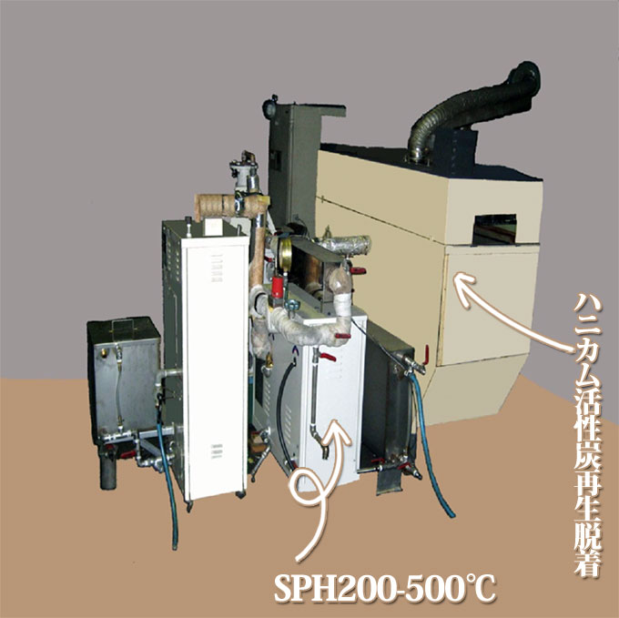 使用されたハニカム活性炭をスーパーヒーティングを使用して330℃にて脱着回復させ再利用できる装置です。ハニカム活性炭は再生され繰り返し使用できます。