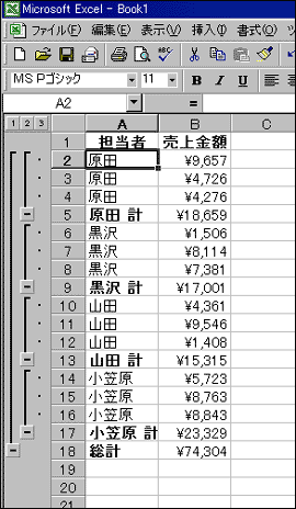 | グループごとに表示を切り替えるには、アウトライン記号の行レベルバーを操作します。図4 の 6 行目から 8 行目の左側に表示されている行レベル バーをクリックするか、"黒沢 計" の左側にある詳細データの記号 [-] をクリックすると、黒沢さんの詳細データが非表示になります。詳細データを再表示するには、詳細表示記号 [+] をクリックします(図7)。 | ||||